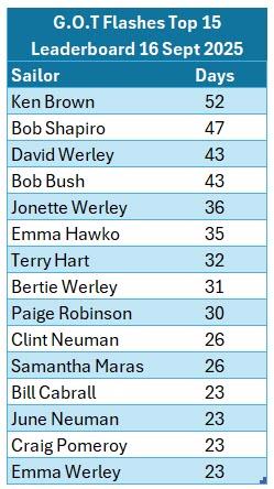 Looking at the rest of the Leaderboard, Bob Shapiro is currently in second place with 47 days on the water and David Werley and Bob Bush are tied for third with 43. The fall regatta schedule is full of fantastic events, and there is plenty of time for YOU to make it across the 50 sail line -Get Out There!